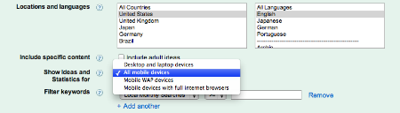 Recommended Mobile Keyword Research Tool: Google AdWords Keyword Research Tool offers several filtering options for mobile: All Mobile Devices, Mobile WAP Devices, Mobile Devices with Full Internet Browsers. Now you can leverage mobile-specific keyword insight when creating content that is likely to be consumed via mobile devices whether it’s a dedicated mobile site or a general website that is mobile friendly.
