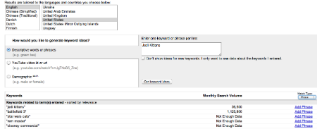 Recommended Image Keyword Research Tool: Google Insights for Search using the Images filter, provides “top searches” and “rising searches” relevant to your query. You are also provided with regional interest over time that is presented as an animation highlighting different areas on a map as the popularity of the search term rises there. There are a number of additional filters including geographic region, time frame and industry category. Additional top level filters include News, Web and Product search, so essentially this is another tool for news keyword research as well.