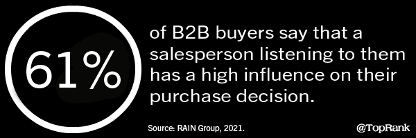 71 percent of B2B buyers said that the top influence on their decision to purchase was when a salesperson leads a thorough discovery of their concerns, wants, and needs, followed by 68 percent who said showing what’s possible or how to solve a problem had an significant influence on buying decisions, with the same percentage noting that a salesperson who listens to them affects their purchasing decision, according to newly-released survey data. MarketingProfs