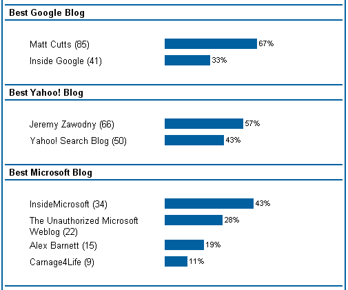 Surprisingly, Matt Cutts lagged way behind in the SEO category, but he did win best Google blog over the corporate Google blog. Jeremy Zawodny also beat out the Yahoo Search blog. Hmmm, do you think there might be a message there?