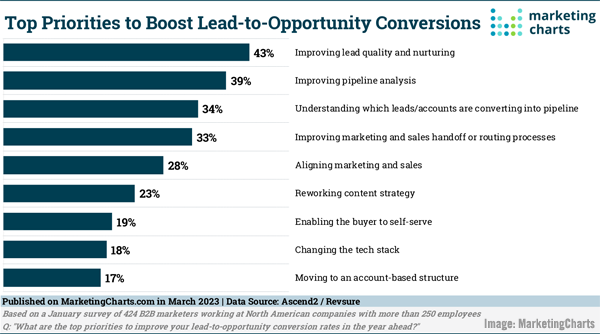 43 percent of U.S. B2B marketers have said that improving the quality of the leads they gather and the nurturing they perform is a top priority when it comes to increasing conversion rates, with 39 percent pointing to improved pipeline analysis, and 34 percent who pinpointed better having a better understanding of which leads convert in their organization’s pipeline — some of the findings included in newly-published survey data of interest to B2B marketers. MarketingCharts