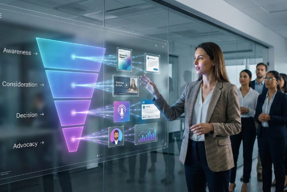 A strong content marketing strategy begins with knowing what buyers are trying to understand. That’s the role of a data-informed approach: it surfaces the questions, patterns, and pressure points that should shape your marketing. The next step is turning those insights into a connected program that carries a clear story through every stage of the journey.