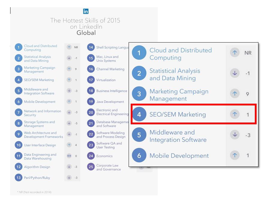 According to the most recent LinkedIn data, SEO and SEM ranks 4th among top skills companies seek (below).