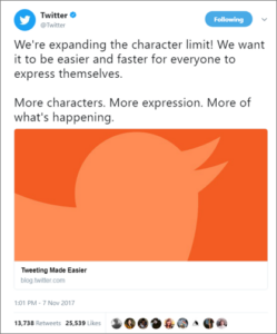 The official switch to a 280-character limit came in early November, giving users (and brands and marketers) more space to express themselves—while still staying as true as possible to its commitment to brevity.