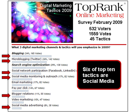 With concerns over the recession and its impact on marketing, we decided to run a TopRank Reader Poll to discover reader (and their networks) preferences for digital marketing tactics in 2009. Companies world-wide are cutting costs as well as looking for creative, high impact and accountable marketing. Our amazing readers both on Online Marketing Blog and followers at @leeodden helped uncover the top tactics.